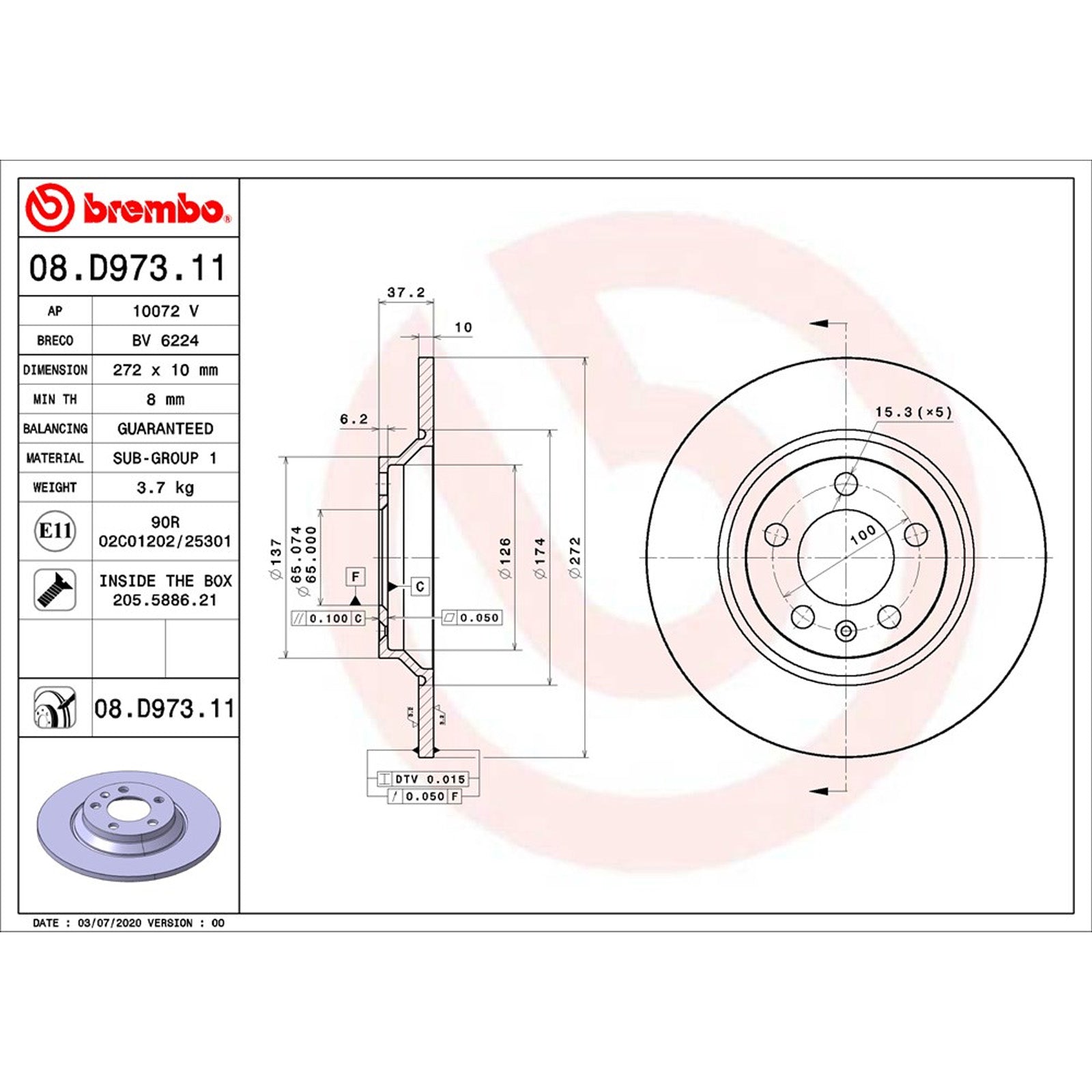 Manufacturer: Brembo Brand: Brembo Manufacturers Part Number: 08.D973.11 Product Type: Solid Brake Discs Placement on Vehicle: Rear Colour: NA Material: Not Available EAN: 8020584313008 Weight: 15000 g Dimensions: 300 x 300 x 300cm