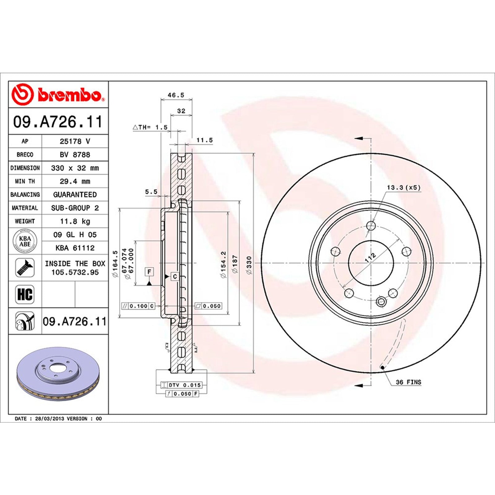 Manufacturer: Brembo Brand: Brembo Manufacturers Part Number: 09.A726.11 Product Type: Coated Vented Brake Discs Placement on Vehicle: Front Colour: NA Material: HC Cast Iron EAN: 8020584020197 Weight: 12346 g Dimensions: 60 x 360 x 360cm