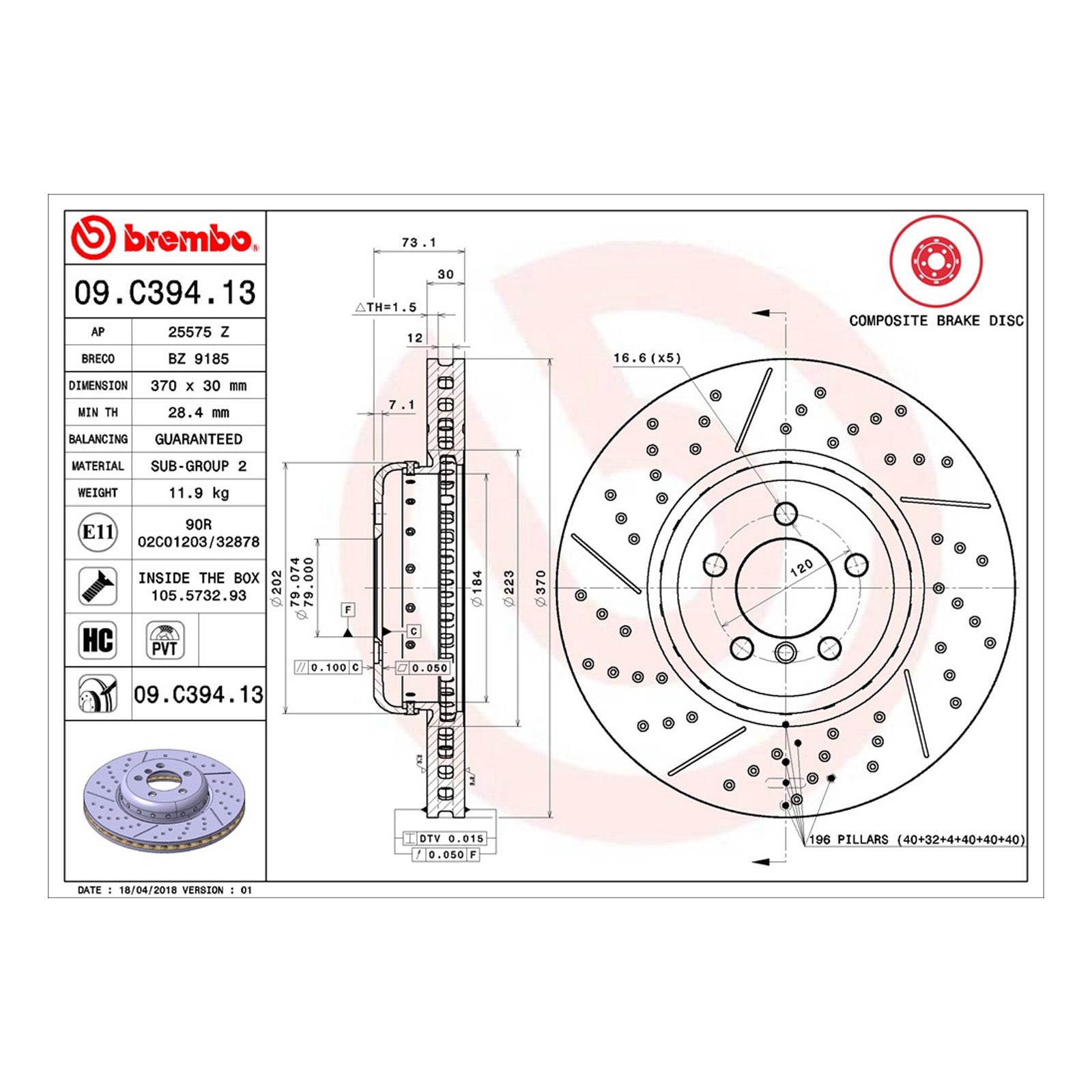 Manufacturer: Brembo Brand: Brembo Manufacturers Part Number: 09.C394.13 Product Type: Coated PVT Drilled & Grooved Brake Discs Placement on Vehicle: Front Colour: NA Material: HC Cast Iron EAN: 8020584220870 Weight: 12490 g Dimensions: 85 x 380 x 380cm