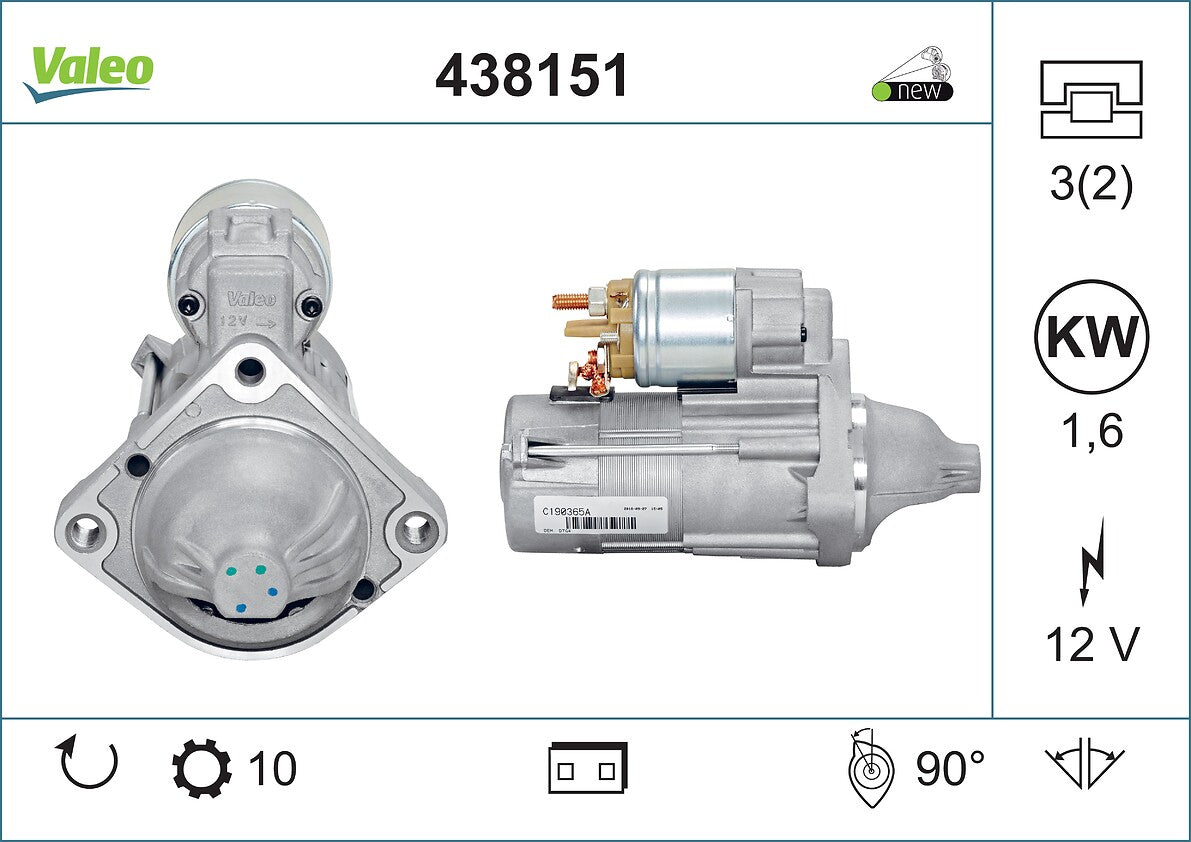 Manufacturer: Valeo Brand: Valeo Manufacturers Part Number: 438151 Product Type: Starter Motors Placement on Vehicle: NA EAN: 3276424381514 Weight: 3530 g Dimensions: 293 x 161 x 137cm
