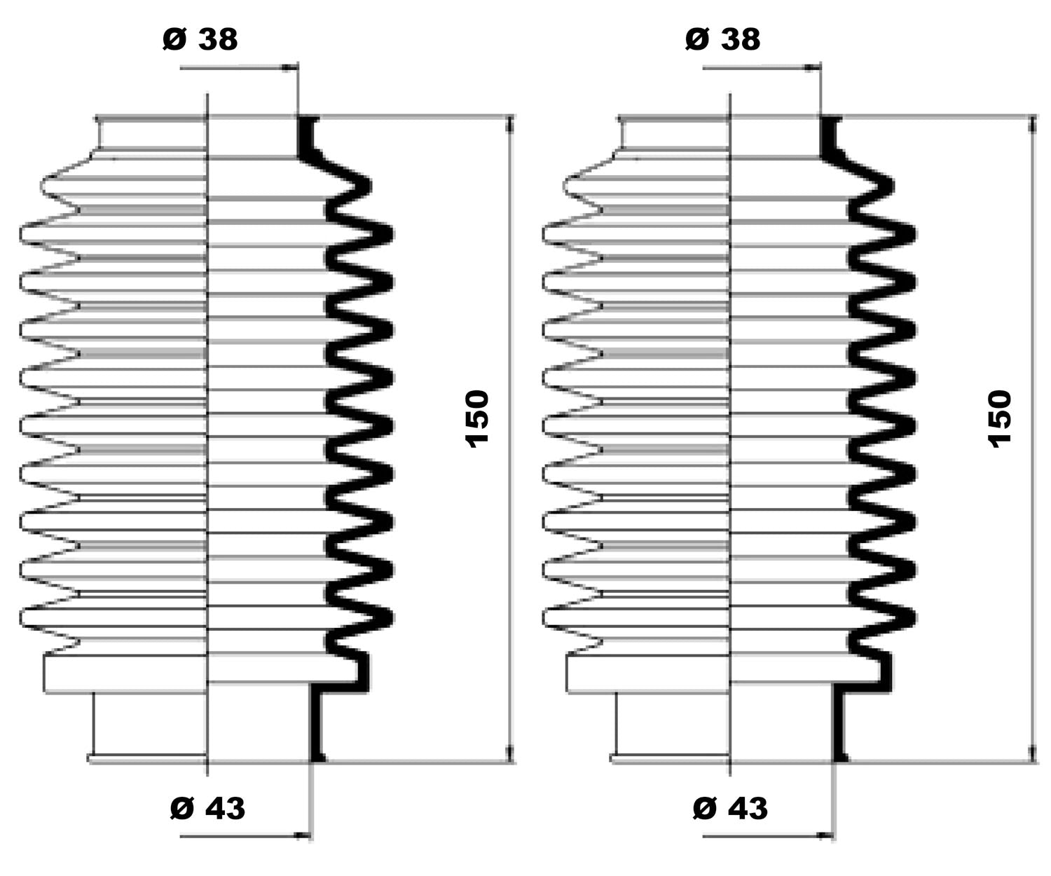 Inner Diameter (mm): 43Inner Diameter 1 (mm): 43Length (mm): 150Length 1 (mm): 150Outer Diameter (mm): 38Outer Diameter 1 (mm): 38Vehicle Note: for vehicles without power steeringMake and model this part will fit